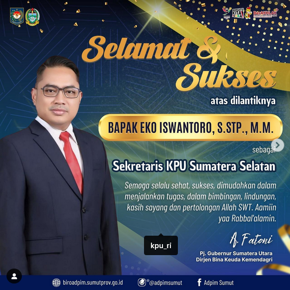 #Temanpemilih Selamat atas dilantiknya Bapak Eko Iswantoro sebagai Sekretaris KPU Provinsi Sumatera Selatan.