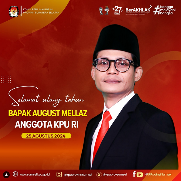 #TemanPemilih, KPU Provinsi Sumatera Selatan mengucapkan selamat ulang tahun kepada Anggota KPU RI, Bapak @augustmellaz .