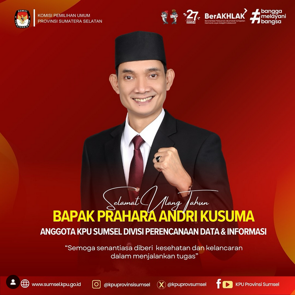 #TemanPemilih, Selamat Hari Ulang Tahun kepada Bapak Prahara Andri Kusuma, Anggota KPU Sumsel Divisi Perencanaan Data dan Informasi.