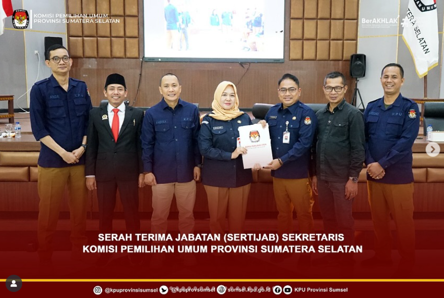 #Temanpemilih, Komisi Pemilihan Umum Provinsi Sumatera Selatan melaksanakan serah terima jabatan Sekretaris dari bapak Eko Iswantoro, S.STP., M.M kepada Ibu Haslinda, S.E., M.M. Kegiatan ini berlangsung di Aula Demokrasi Kelly Mariana KPU Sumsel dalam suasana penuh khidmat dan kebersamaan, Selasa (22/7/2025).