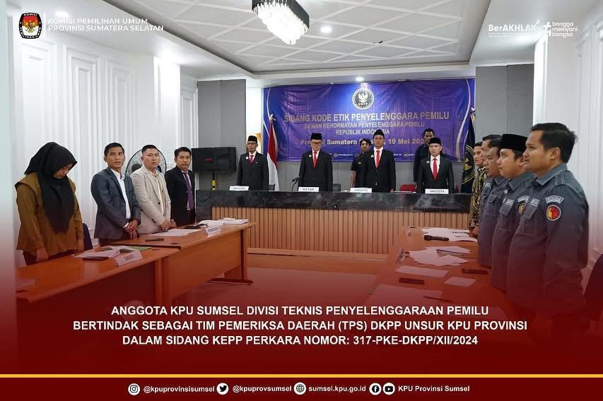 Temanpemilih Anggota KPU Sumsel Divisi Teknis Penyelenggara Pemilu, Bapak Handoko hadir sebagai Tim Pemeriksa Daerah (TPD) DKPP unsur KPU Provinsi dalam sidang kode etik penyelenggara Pemilu perkara nomor: 317-PKE-DKPP/XII/2024 dengan teradu Anggota Bawaslu Kabupaten Musi Banyuasin, Senin (19/5/2025).
