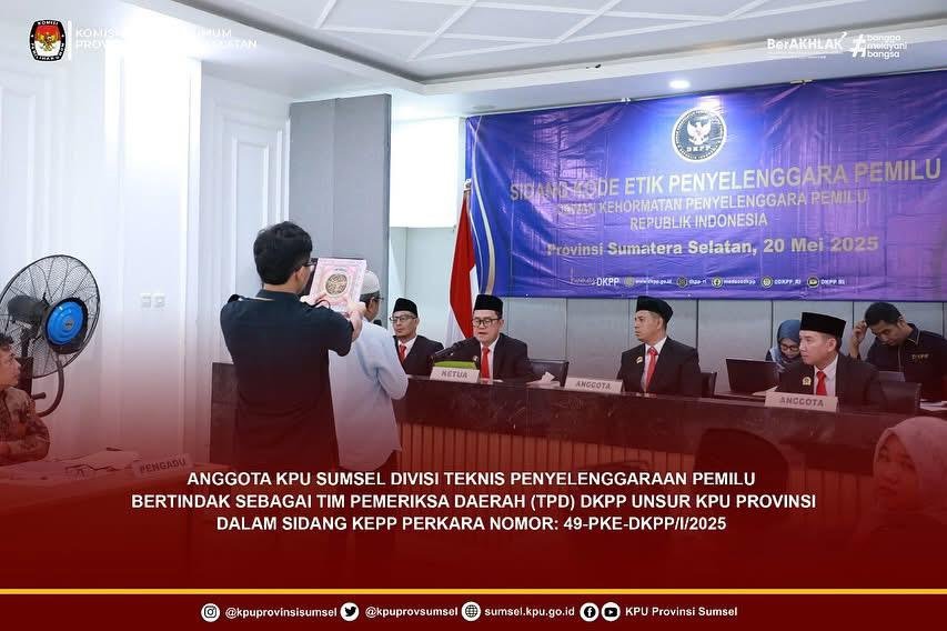 Temanpemilih Anggota KPU Sumsel Divisi Teknis Penyelenggara Pemilu, Bapak Handoko hadir sebagai Tim Pemeriksa Daerah (TPD) DKPP unsur KPU Provinsi dalam sidang kode etik penyelenggara Pemilu perkara nomor: NOMOR: 49-PKE-DKPP/I/2025 dengan teradu Anggota Bawaslu Kabupaten Banyuasin, Selasa (20/5/2025).