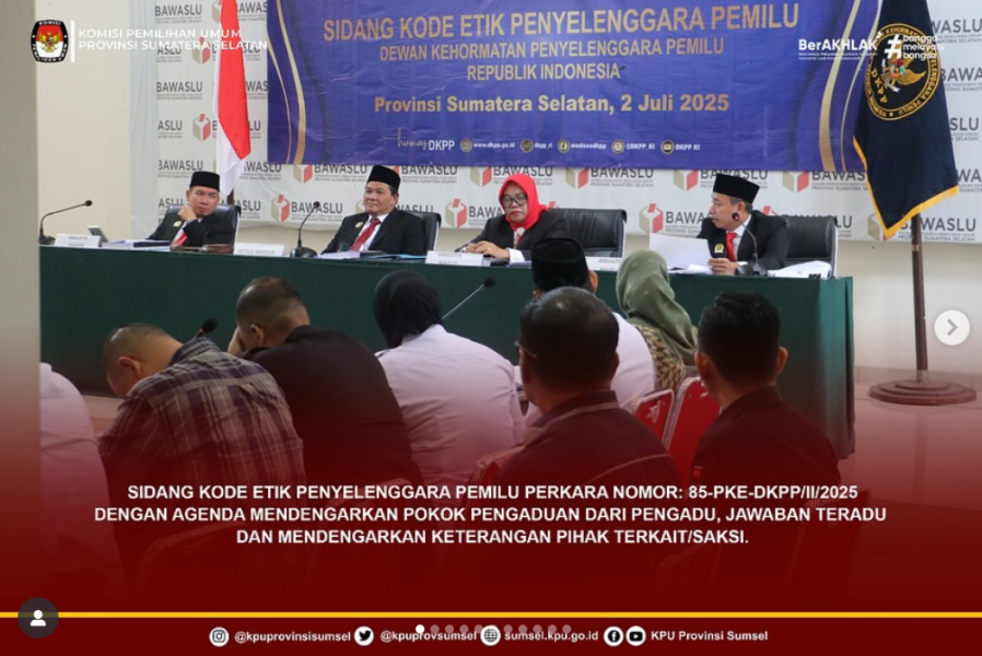 #Temanpemilih Anggota KPU Sumsel Divisi Hukum dan Pengawasan bertindak sebagai Tim Pemeriksa Daerah Unsur KPU Provinsi dalam sidang kode etik penyelenggara Pemilu perkara nomor: 85-PKE-DKPP/II/2025 dengan teradu Ketua dan Anggota Bawaslu Kabupaten Ogan Ilir dalam agenda Mendengarkan pokok pengaduan dari Pengadu, jawaban Teradu dan mendengarkan keterangan Pihak Terkait/Saksi di ruang sidang, Rabu (3/7/2025).