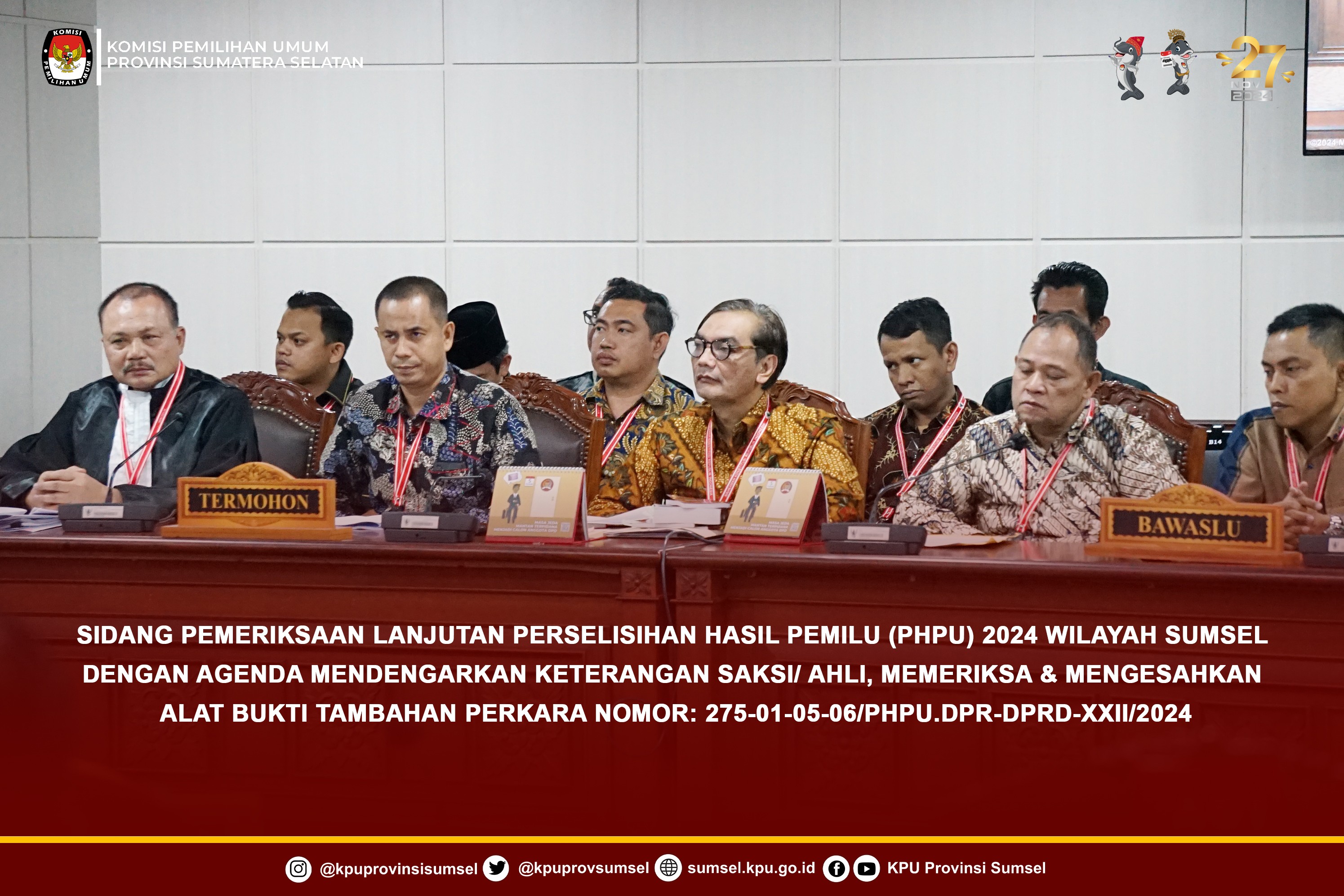 #Temanpemilih, Anggota KPU Sumsel Divisi Teknis Penyelenggaraan Pemilu, Bapak Handoko dan Anggota Divisi Hukum dan Pengawasan, Bapak Nurul Mubarok hadir sebagai termohon dalam sidang pemeriksaan lanjutan Perselisihan Hasil Pemilu (PHPU) Wilayah ProvinsI Sumatera Selatan tahun 2024 dengan agenda mendengarkan keterangan Saksi/ Ahli, memeriksa dan mengesahkan alat bukti tambahan dengan nomor perkara: 275-01-05-06/PHPU.DPR-DPRD-XXII/2024 di Panel 3 Ruang Persidangan Mahkamah Konstitusi, Rabu (29/5/2024).