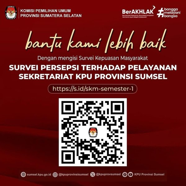 #Temanpemilih yuk bantu KPU Sumsel agar semakin baik lagi dalam memberikan pelayanan publik dengan cara mengisi survei kepuasan masyarakat pada link https://s.id/skm-semester-1 atau scan QR Code di atas.