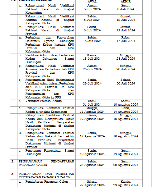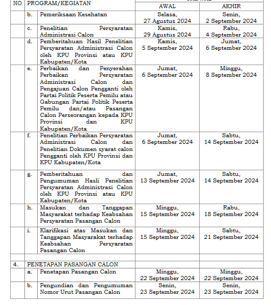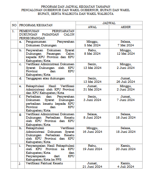 Tahapan dan Jadwal Pencalonan Gubernur dan Wakil Gubernur, Bupati dan Wakil Bupati , Wali Kota dan Wakil Wali Kota