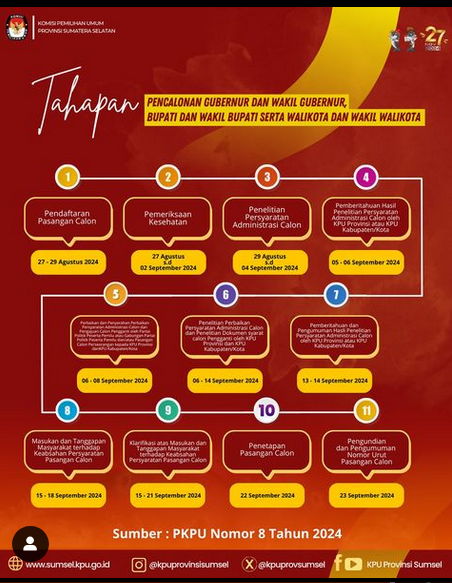 #Temanpemilih berikut tahapan pendaftaran dan penelitian persyaratan pasangan calon Gubernur dan Wakil Gubernur, Bupati dan Wakil Bupati serta Walikota dan Wakil Walikota tahun 2024 berdasarkan PKPU Nomor 8 Tahun 2024.