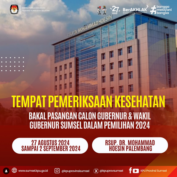 #Temanpemilih Rumah Sakit Umum Pusat (RSUP) Dr. Mohammad Hoesin Palembang ditetapkan sebagai Rumah Sakit yang ditunjuk untuk tempat dilaksanakannya pemeriksaan Bakal Pasangan Calon Gubernur dan Wakil Gubernur Sumsel dalam Pemilihan setentak tahun 2024 bersasarkan Keputusan KPU Sumsel Nomor 108 Tahun 2024.