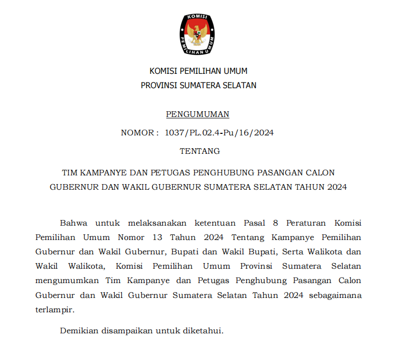 Pengumuman Nomor: 1037/PL.02.4-Pu/16/2024 Tentang Tim Kampanye Dan Petugas Penghubung Pasangan Calon Gubernur Dan Wakil Gubernur Sumatera Selatan Tahun 2024