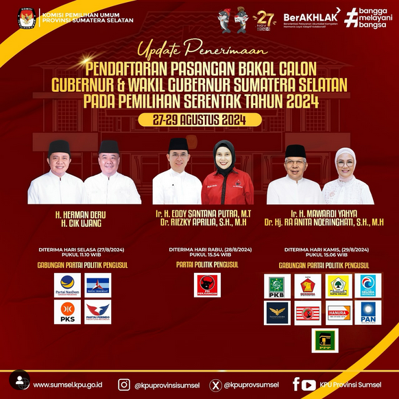 Update Penerimaan Pendaftaran Pasangan Bakal Calon Gubernur & Wakil Gubernur Sumatera Selatan Pada Pemilihan Serentak Tahun 2024