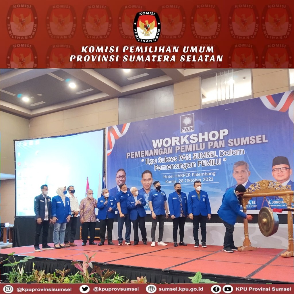 Ketua KPU Provinsi Sumatera Selatan menjadi salah satu Narasumber pada kegiatan Workshop Pemenangan Pemilu PAN Sumsel dengan tema " Tiga Sukses PAN Sumsel Dalam Pemenangan Pemilu" di Hotel Harpper Palembang,