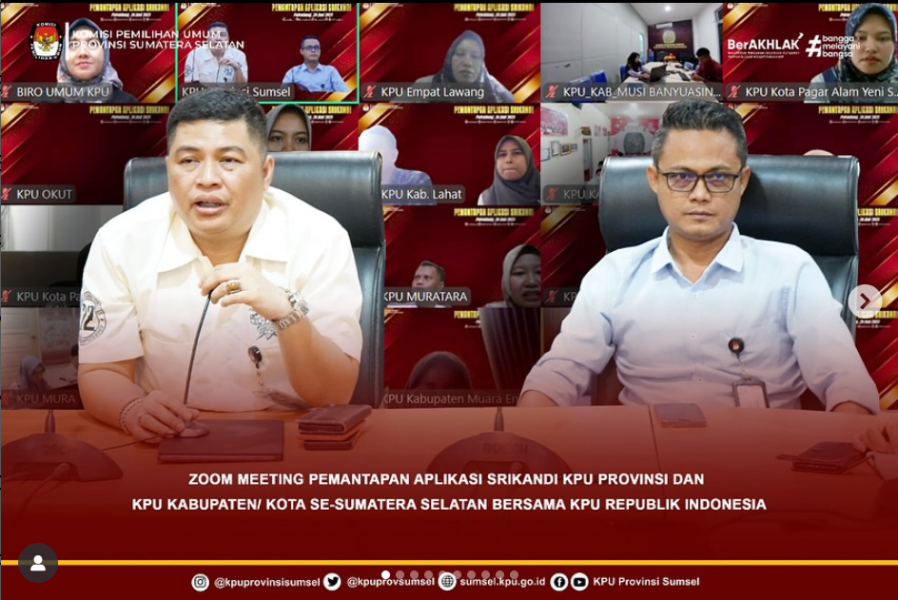 #Temanpemilih Kabag Keuangan Umum dan Logistik, Bapak Muhammad Ridho didampingi Kasubbag Umum dan Logistik, Bapak Muhammad Habibullah melaksanakan Zoom Meeting Pemantapan Aplikasi Srikandi KPU Provinsi/Kabupaten/Kota se-Sumsel bersama KPU Republik Indonesia secara daring, Rabu (25/6/2025).