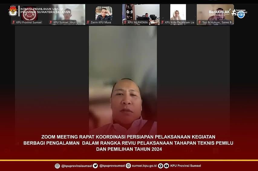 pemilih KPU Provinsi Sumatera Selatan bersama KPU Kabupaten/Kota se-Sumsel melaksanakan zoom meeting rapat koordinasi persiapan pelaksanaan berbagi pengalaman dalam rangka reviu tahapan teknis Pemilu dan Pemilihan tahun 2024, Sabtu (10/5/2025)
